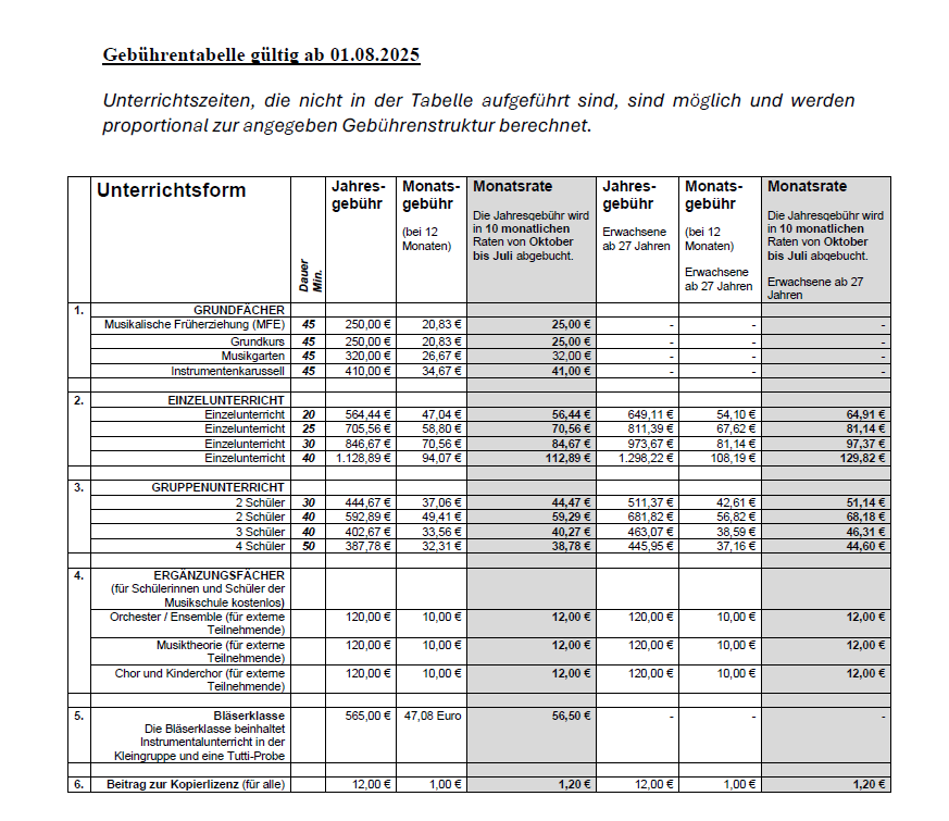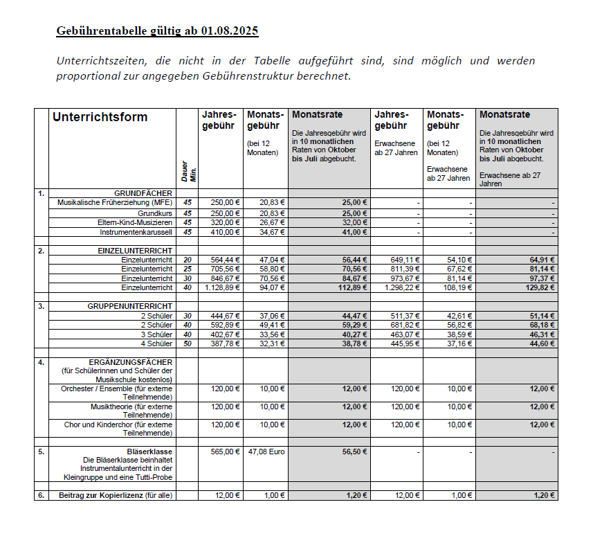 Änderungs-SEPA-Lastschriftmandat DownloadSie können auch gerne über die Musikschule Instrumente – soweit vorhanden – mieten. Die Mietkosten können Sie der Gebührenliste in der Gebührensatzung entnehmen. Informationen über weitere Mietinstrumente erhalten Sie auch über die Geschäftsstelle oder die Fachbereichsleiter. Wir bieten unter bestimmten Umständen die Möglichkeit einer Gebührenermäßigung.